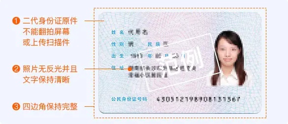 身份证正反面四角要齐全,每个字都要清晰,人像清晰不能反光,不要过期,不要翻拍,不要霸屏
